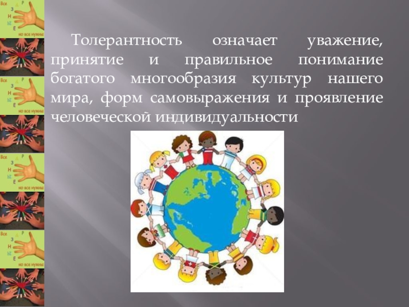 Слайд 3 Толерантность означает уважение, принятие и правильное понимание богатого многообразия культур нашего