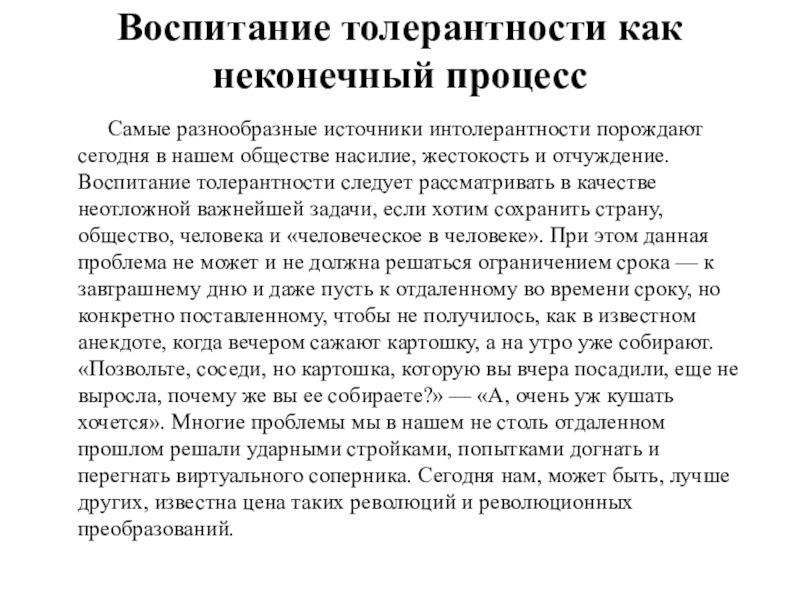 нашем обществе насилие, жестокость и отчуждение. Воспитание толерантности следует рассматривать в качестве неотложной важнейшей задачи, если хотим сохранить страну, общество, человека и «человеческое в человеке». При этом данная проблема не может и не должна решаться ограничением срока — к завтрашнему дню и даже пусть к отдаленному во времени сроку, но конкретно поставленному, чтобы не получилось, как в известном анекдоте, когда вечером сажают картошку, а на утро уже собирают. «Позвольте, соседи, но картошка, которую вы вчера посадили, еще не выросла, почему же вы ее собираете?» — «А, очень уж кушать хочется». Многие проблемы мы в нашем не столь отдаленном прошлом решали ударными стройками, попытками догнать и перегнать виртуального соперника. Сегодня нам, может быть, лучше других, известна цена таких революций и революционных преобразований.