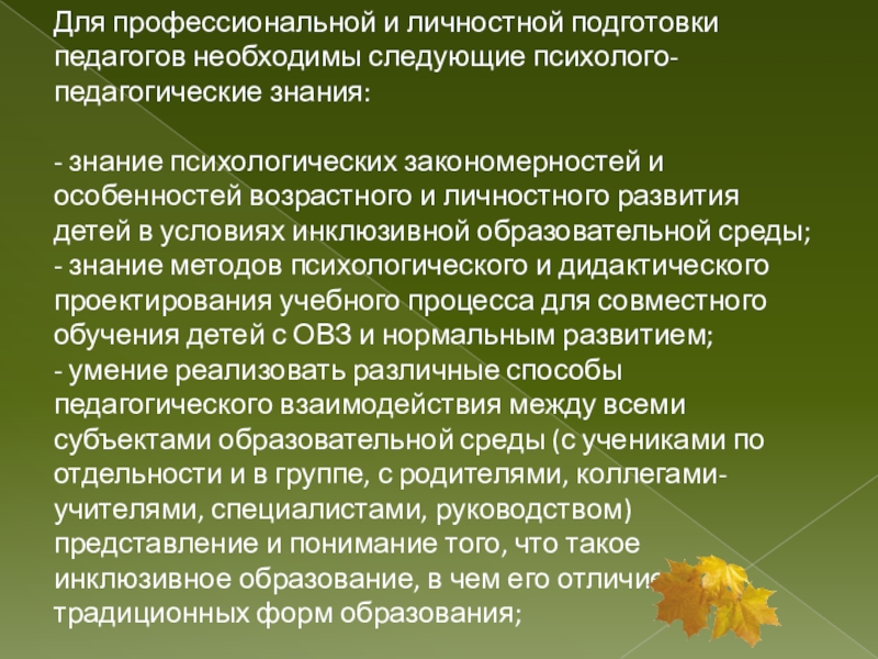 Слайд 13Для профессиональной и личностной подготовки педагогов необходимы следующие психолого-педагогические знания: