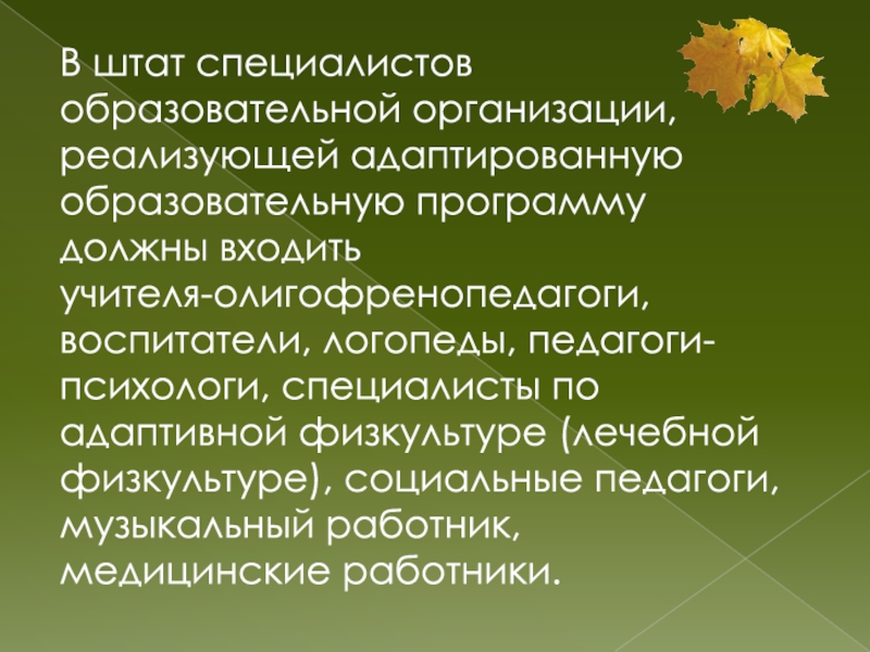 Слайд 11В штат специалистов образовательной организации, реализующей адаптированную образовательную программу должны входить