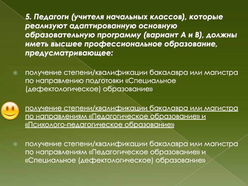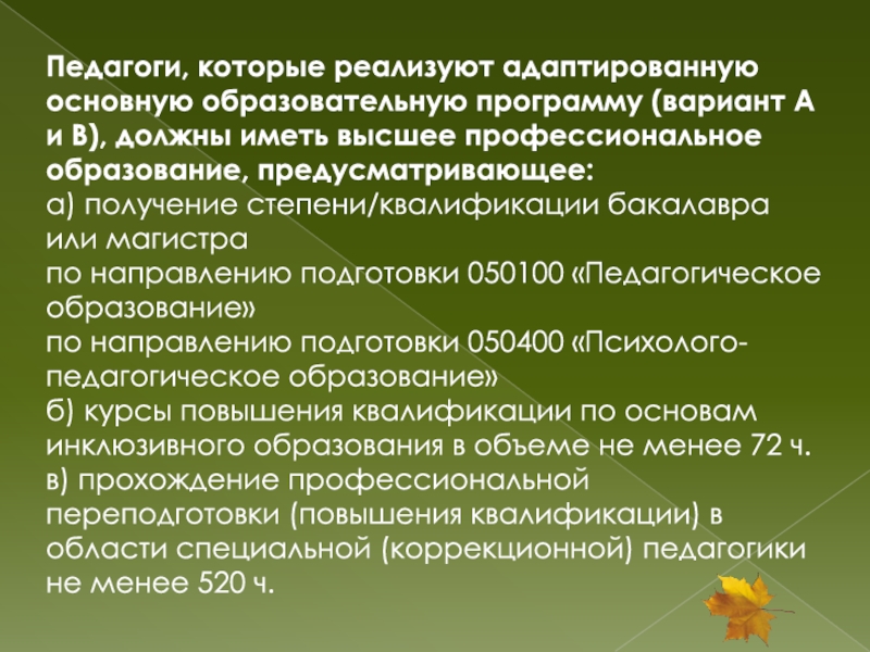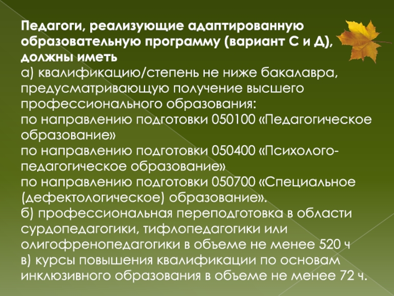 Слайд 10Педагоги, реализующие адаптированную образовательную программу (вариант С и Д), должны иметь