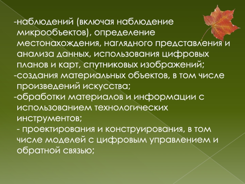 Слайд 28наблюдений (включая наблюдение микрообъектов), определение местонахождения, наглядного представления и анализа данных,