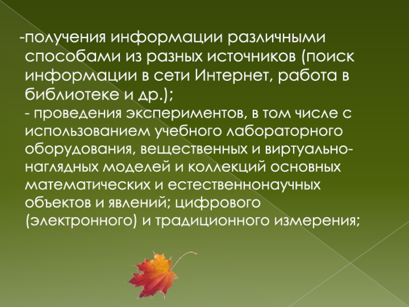 - проведения экспериментов, в том числе с использованием учебного лабораторного оборудования, вещественных и виртуально-наглядных моделей и коллекций основных математических и естественнонаучных объектов и явлений; цифрового (электронного) и традиционного измерения;