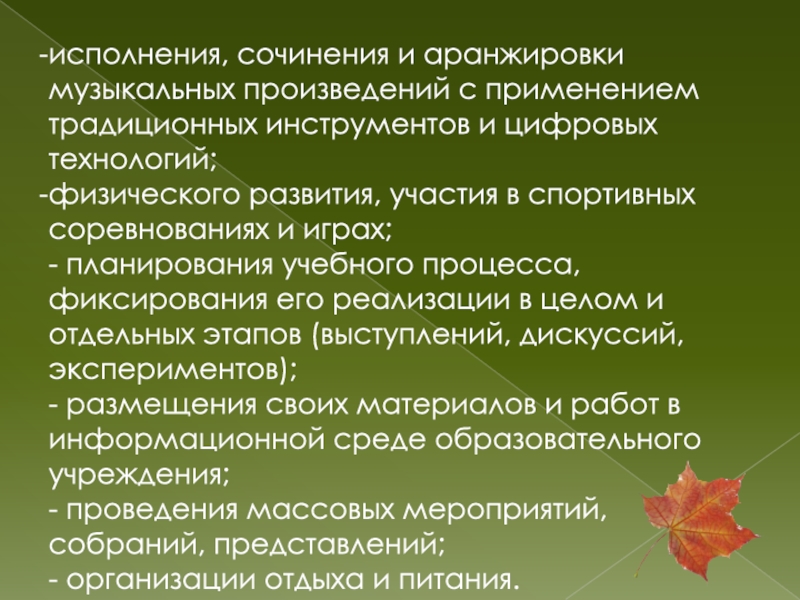 Слайд 29исполнения, сочинения и аранжировки музыкальных произведений с применением традиционных инструментов и