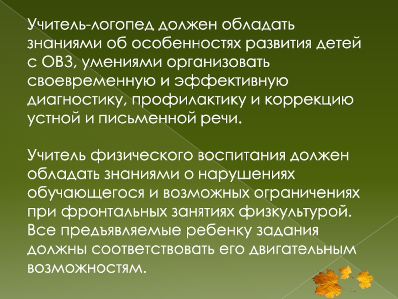 Слайд 15Учитель-логопед должен обладать знаниями об особенностях развития детей с ОВЗ, умениями