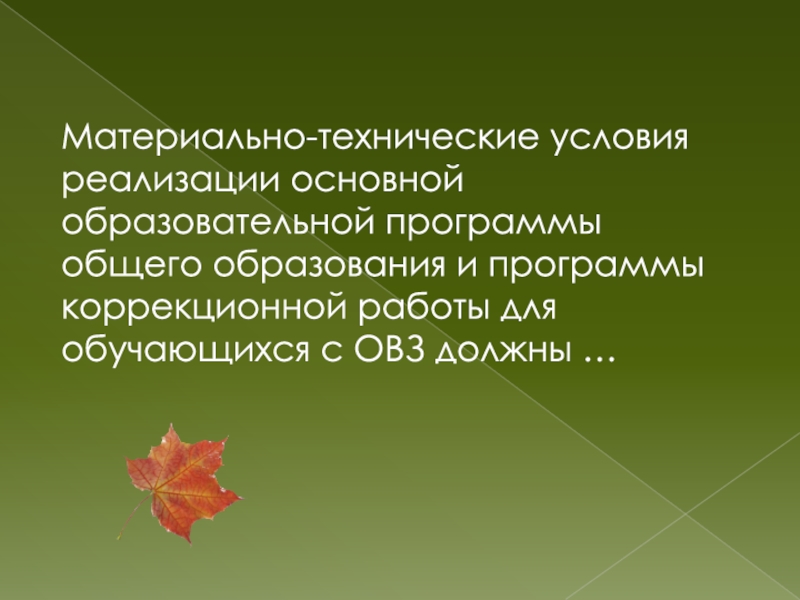 Слайд 22Материально-технические условия реализации основной образовательной программы общего образования и программы коррекционной