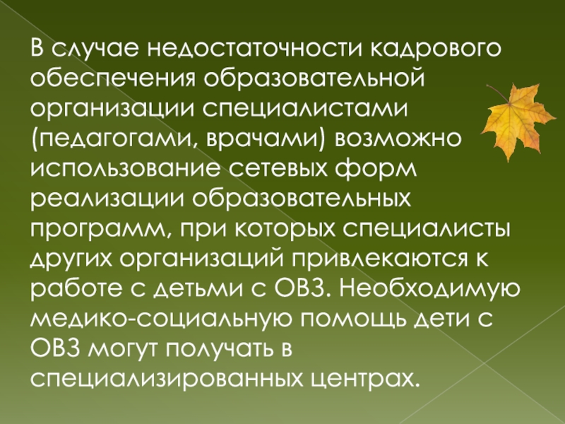 Слайд 18В случае недостаточности кадрового обеспечения образовательной организации специалистами (педагогами, врачами) возможно