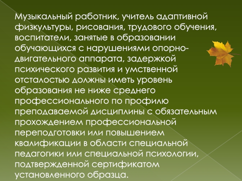 образовании обучающихся с нарушениями опорно-двигательного аппарата, задержкой психического развития и умственной отсталостью должны иметь уровень образования не ниже среднего профессионального по профилю преподаваемой дисциплины с обязательным прохождением профессиональной переподготовки или повышением квалификации в области специальной педагогики или специальной психологии, подтвержденной сертификатом установленного образца.