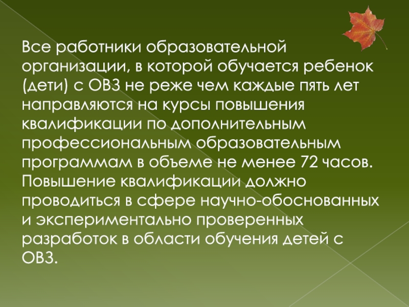 не реже чем каждые пять лет направляются на курсы повышения квалификации по дополнительным профессиональным образовательным программам в объеме не менее 72 часов. Повышение квалификации должно проводиться в сфере научно-обоснованных и экспериментально проверенных разработок в области обучения детей с ОВЗ.