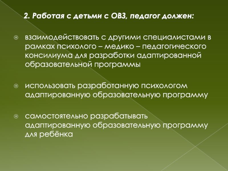 Слайд 40 2. Работая с детьми с ОВЗ, педагог должен: