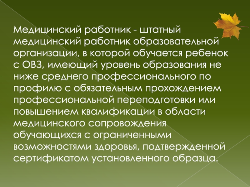ребенок с ОВЗ, имеющий уровень образования не ниже среднего профессионального по профилю с обязательным прохождением профессиональной переподготовки или повышением квалификации в области медицинского сопровождения обучающихся с ограниченными возможностями здоровья, подтвержденной сертификатом установленного образца.