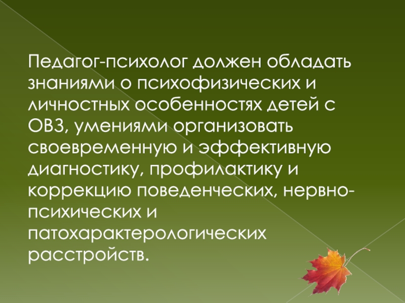 Слайд 14Педагог-психолог должен обладать знаниями о психофизических и личностных особенностях детей с