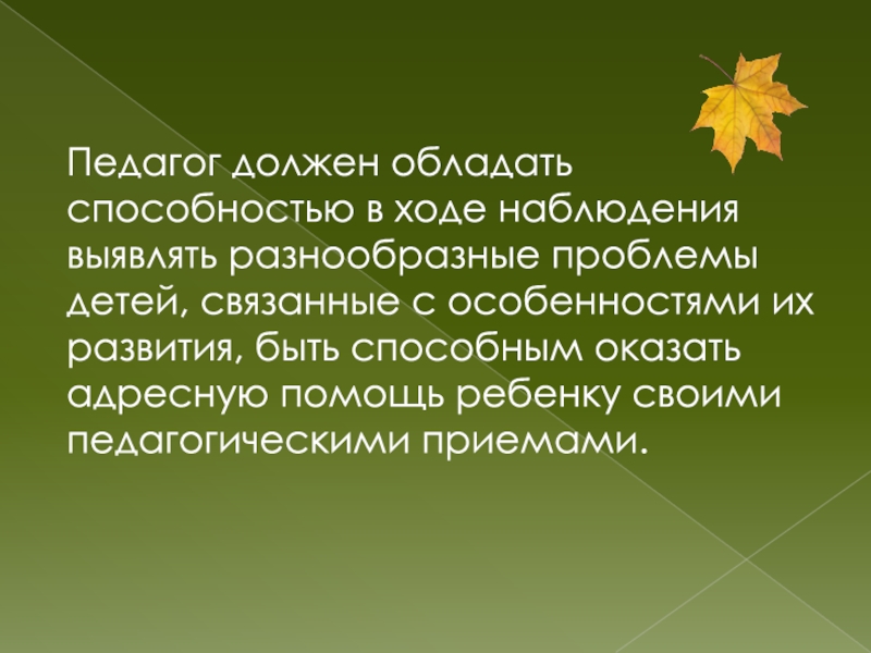 Слайд 6Педагог должен обладать способностью в ходе наблюдения выявлять разнообразные проблемы детей,