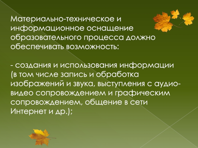 Слайд 26Материально-техническое и информационное оснащение образовательного процесса должно обеспечивать возможность: