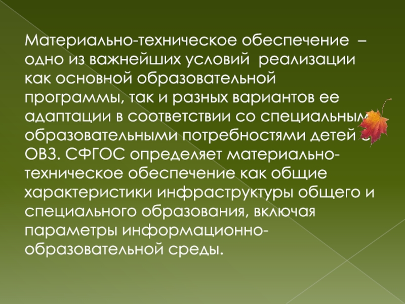 программы, так и разных вариантов ее адаптации в соответствии со специальными образовательными потребностями детей с ОВЗ. СФГОС определяет материально-техническое обеспечение как общие характеристики инфраструктуры общего и специального образования, включая параметры информационно-образовательной среды.
