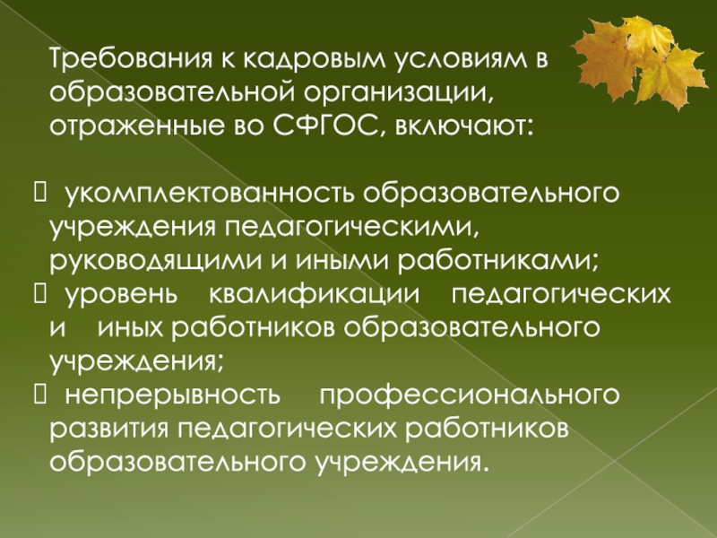 Слайд 8Требования к кадровым условиям в образовательной организации, отраженные во СФГОС, включают: