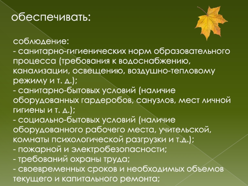 - санитарно-гигиенических норм образовательного процесса (требования к водоснабжению, канализации, освещению, воздушно-тепловому