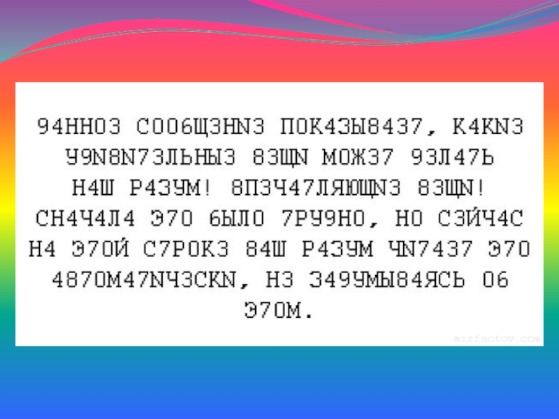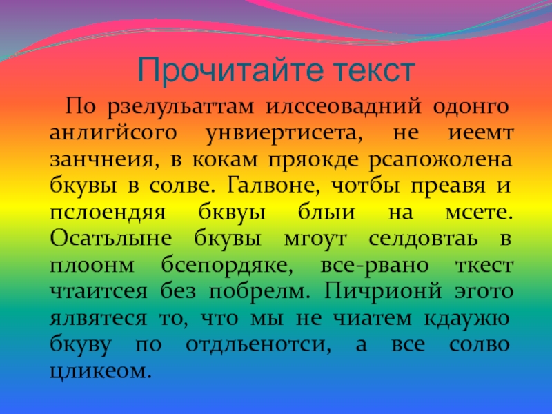 Прочитайте текст  По рзелульаттам илссеовадний одонго анлигйсого унвиертисета, не иеемт занчнеия, в кокам пряокде рсапожолена бкувы