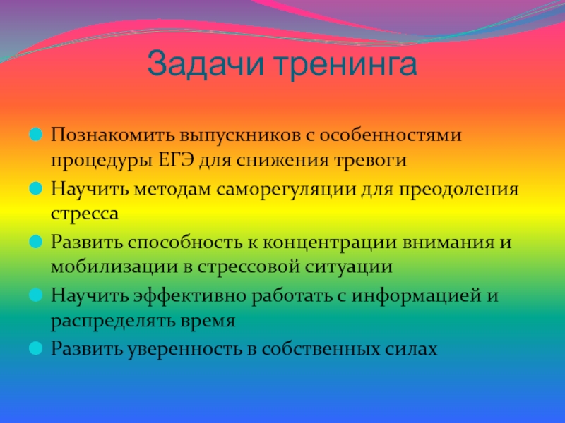 Задачи тренингаПознакомить выпускников с особенностями процедуры ЕГЭ для снижения тревогиНаучить методам саморегуляции для преодоления стрессаРазвить способность к