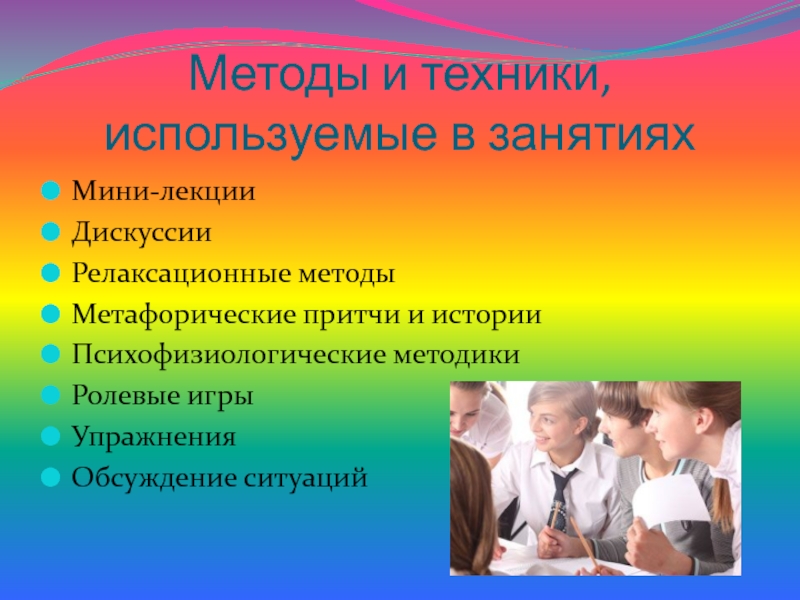 Методы и техники, используемые в занятияхМини-лекцииДискуссииРелаксационные методыМетафорические притчи и историиПсихофизиологические методикиРолевые игрыУпражненияОбсуждение ситуаций