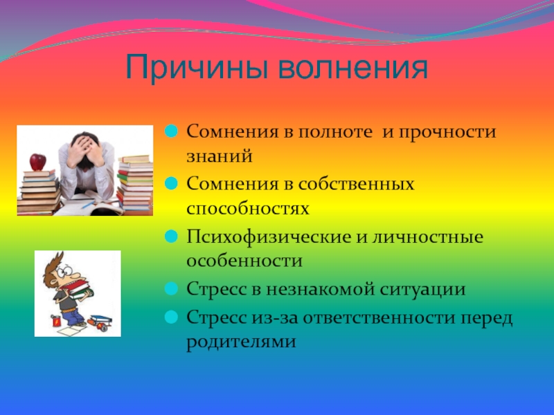 Причины волненияСомнения в полноте и прочности знанийСомнения в собственных способностяхПсихофизические и личностные особенностиСтресс в незнакомой ситуацииСтресс из-за