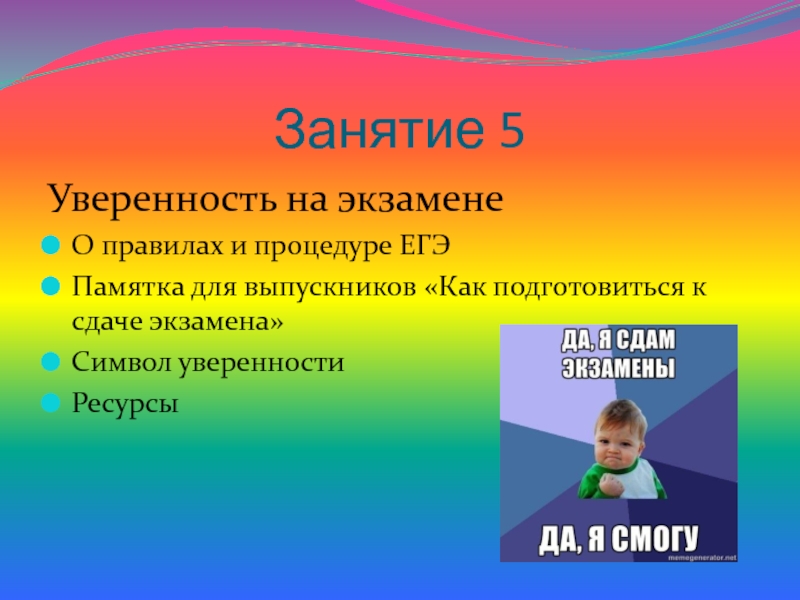 Занятие 5Уверенность на экзаменеО правилах и процедуре ЕГЭПамятка для выпускников «Как подготовиться к сдаче экзамена»Символ уверенностиРесурсы