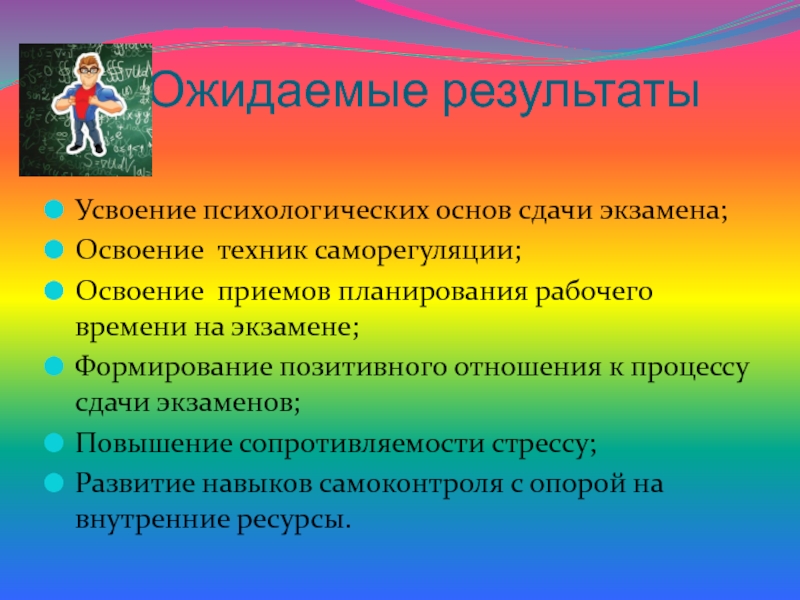 Ожидаемые результатыУсвоение психологических основ сдачи экзамена;Освоение техник саморегуляции;Освоение приемов планирования рабочего времени на экзамене;Формирование позитивного отношения к