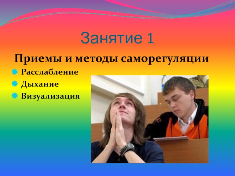 Занятие 1Приемы и методы саморегуляцииРасслаблениеДыхание Визуализация