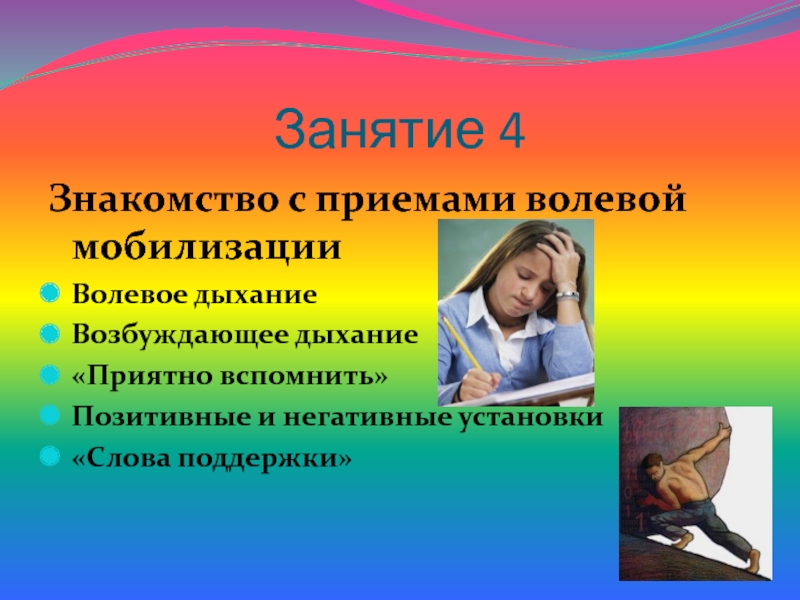 Занятие 4Знакомство с приемами волевой мобилизацииВолевое дыханиеВозбуждающее дыхание«Приятно вспомнить»Позитивные и негативные установки«Слова поддержки»