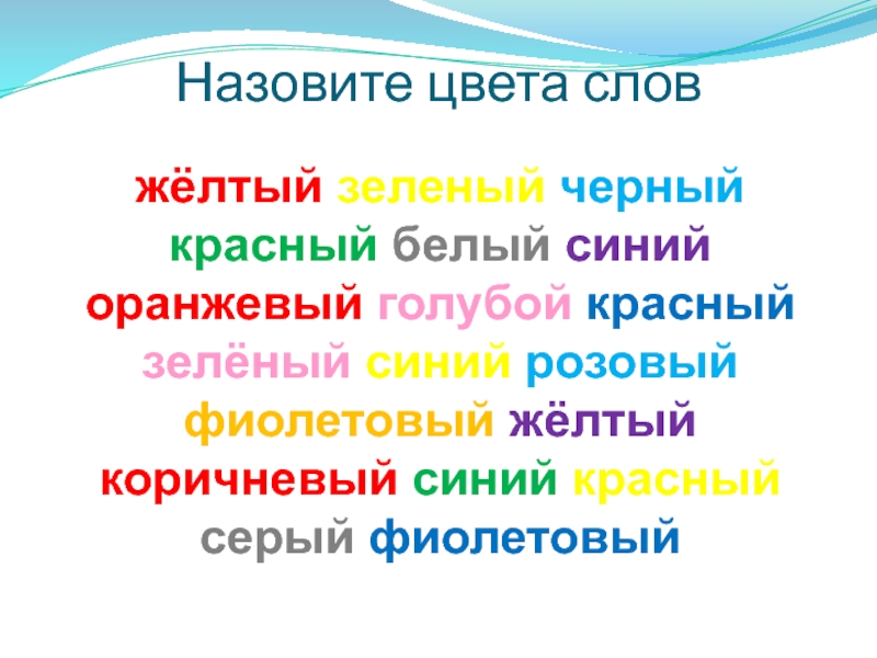 Назовите цвета словжёлтый зеленый черный красный белый синий оранжевый голубой красный зелёный синий розовый фиолетовый жёлтый коричневый