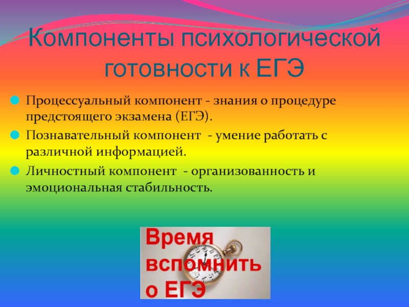 Компоненты психологической готовности к ЕГЭПроцессуальный компонент - знания о процедуре предстоящего экзамена (ЕГЭ).Познавательный компонент - умение работать с различной информацией.Личностный компонент - организованность и эмоциональная стабильность.