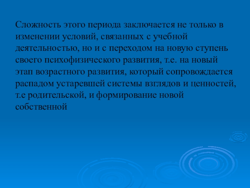 Сложность этого периода заключается не только в изменении условий, связанных с учебной деятельностью, но и с переходом на новую ступень своего психофизического развития, т.е. на новый этап возрастного развития, который сопровождается распадом устаревшей системы взглядов и