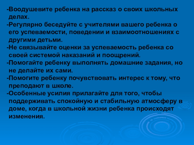 Воодушевите ребенка на рассказ о своих школьных делах.Регулярно беседуйте с учителями вашего ребенка о его успеваемости, поведении