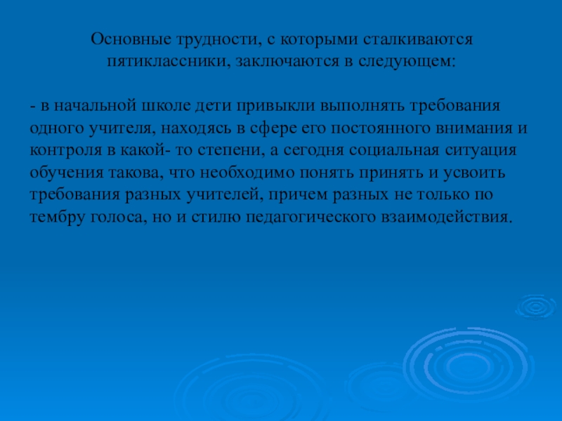 Основные трудности, с которыми сталкиваются пятиклассники, заключаются в следующем:- в начальной школе дети привыкли выполнять требования одного