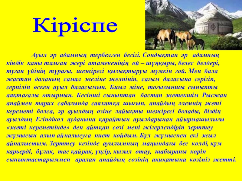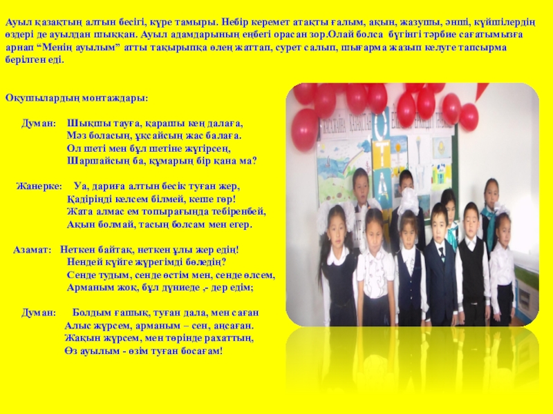 Сонымен, оқушылар болашақта ауыл экономикасын, халық тұрмыс жағдайын көркейтетін сіздерсіздер! Туған елдің алтын бесігін аялау, қорғау сіздердің қолдарыңызда!