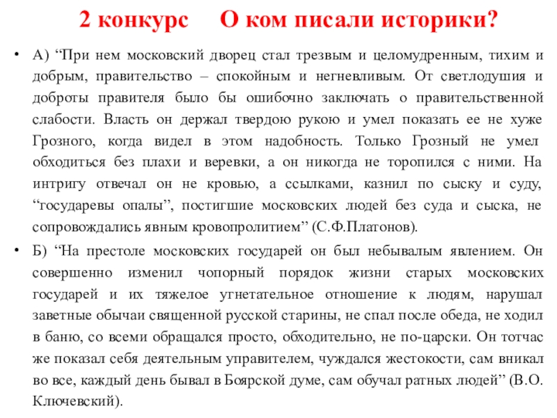 Б) “На престоле московских государей он был небывалым явлением. Он совершенно изменил чопорный порядок жизни старых московских государей и их тяжелое угнетательное отношение к людям, нарушал заветные обычаи священной русской старины, не спал после обеда, не ходил в баню, со всеми обращался просто, обходительно, не по-царски. Он тотчас же показал себя деятельным управителем, чуждался жестокости, сам вникал во все, каждый день бывал в Боярской думе, сам обучал ратных людей” (В.О.Ключевский).