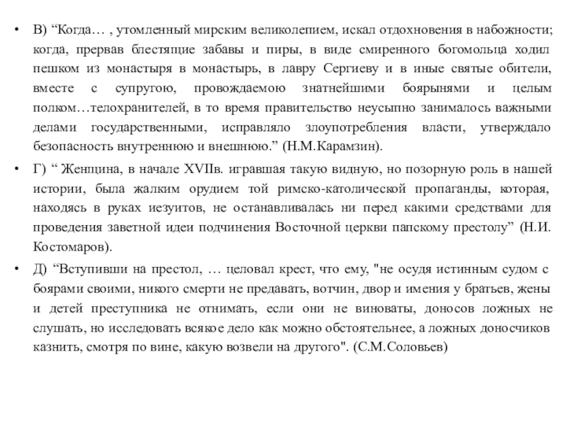 Д) “Вступивши на престол, … целовал крест, что ему, "не осудя истинным судом с боярами своими, никого смерти не предавать, вотчин, двор и имения у братьев, жены и детей преступника не отнимать, если они не виноваты, доносов ложных не слушать, но исследовать всякое дело как можно обстоятельнее, а ложных доносчиков казнить, смотря по вине, какую возвели на другого". (С.М.Соловьев)