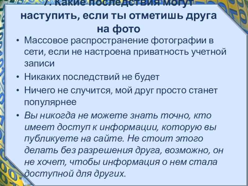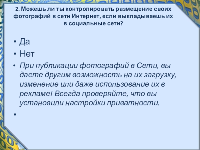 При публикации фотографий в Сети, вы даете другим возможность на их загрузку, изменение или даже использование их в рекламе! Всегда проверяйте, что вы установили настройки приватности.