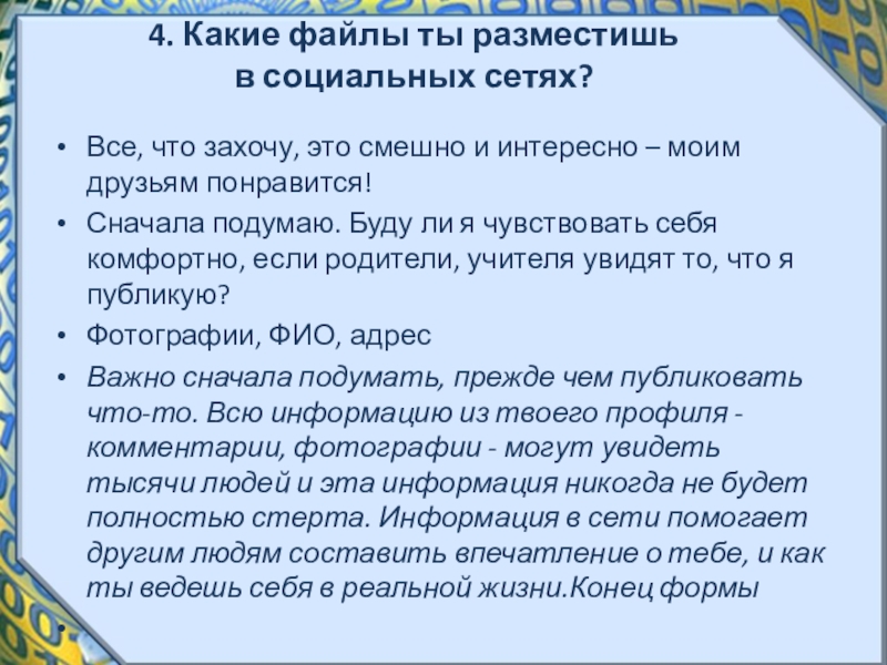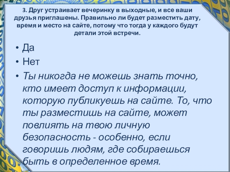 Ты никогда не можешь знать точно, кто имеет доступ к информации, которую публикуешь на сайте. То, что ты разместишь на сайте, может повлиять на твою личную безопасность - особенно, если говоришь людям, где собираешься быть в определенное время.