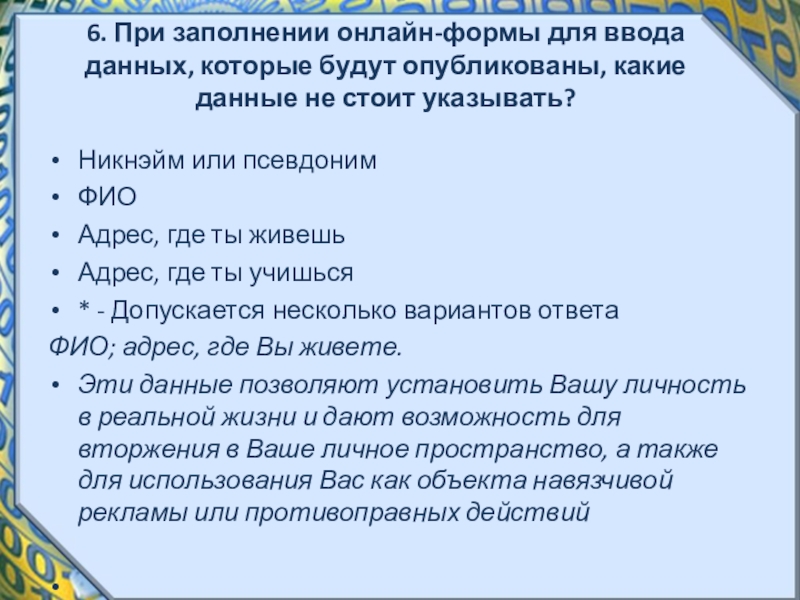Эти данные позволяют установить Вашу личность в реальной жизни и дают возможность для вторжения в Ваше личное пространство, а также для использования Вас как объекта навязчивой рекламы или противоправных действий