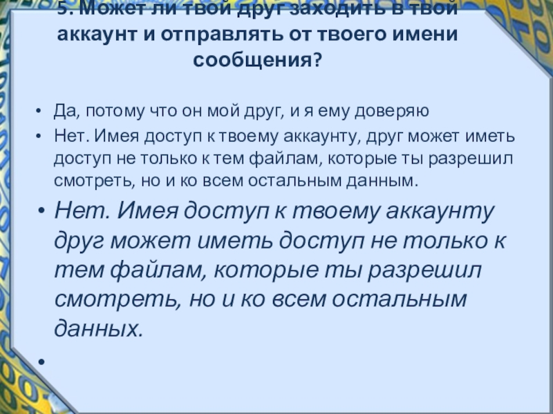 Нет. Имея доступ к твоему аккаунту, друг может иметь доступ не только к тем файлам, которые ты разрешил смотреть, но и ко всем остальным данным.