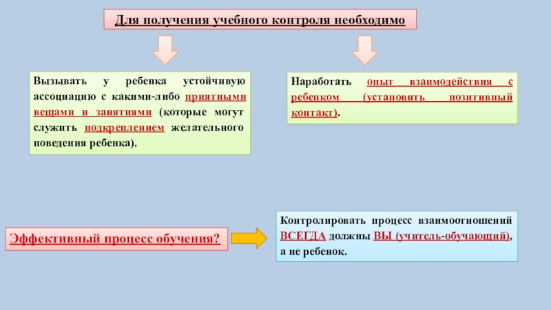 Наличие учебного контроля повышает вероятность того, что Ваши инструкции побудят ребенка дать правильный ответ; если Вы не владеете учебным контролем, Вы скорее всего охарактеризуете поведение ребенка как «упрямое и неуправляемое».