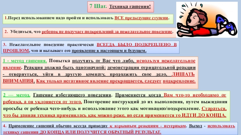4. Применение гашений обычно всегда приводит к взрывным реакциям - истерикам. Выход - использовать технику гашения ДО КОНЦА ИЛИ ПОЛУЧИТСЯ ОБРАТНЫЙ РЕЗУЛЬТАТ.