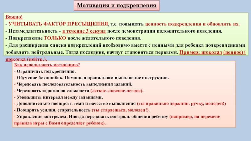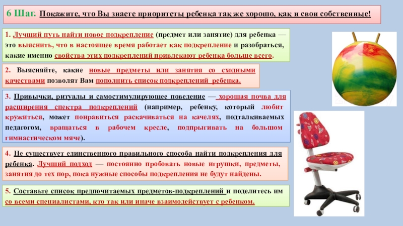 1. Лучший путь найти новое подкрепление (предмет или занятие) для ребенка — это выяснить, что в настоящее время работает как подкрепление и разобраться, какие именно свойства этих подкреплений привлекают ребенка больше всего.