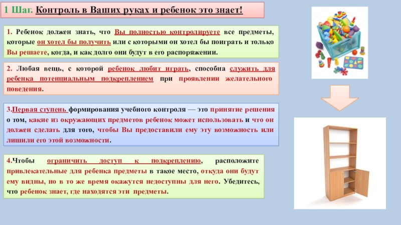 1. Ребенок должен знать, что Вы полностью контролируете все предметы, которые он хотел бы получить или с которыми он хотел бы поиграть и только Вы решаете, когда, и как долго они будут в его распоряжении.