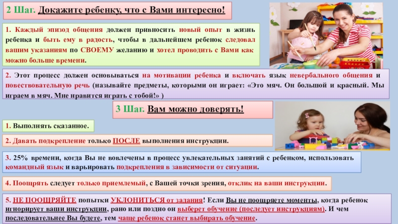 1. Каждый эпизод общения должен привносить новый опыт в жизнь ребенка и быть ему в радость, чтобы в дальнейшем ребенок следовал вашим указаниям по СВОЕМУ желанию и хотел проводить с Вами как можно больше времени.