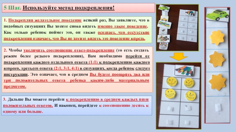 3. Когда Вы установите контроль над предметами или событиями, которые подкрепляют поведение, можете начать использовать их в процессе обучения и поддержания приемлемого поведения.