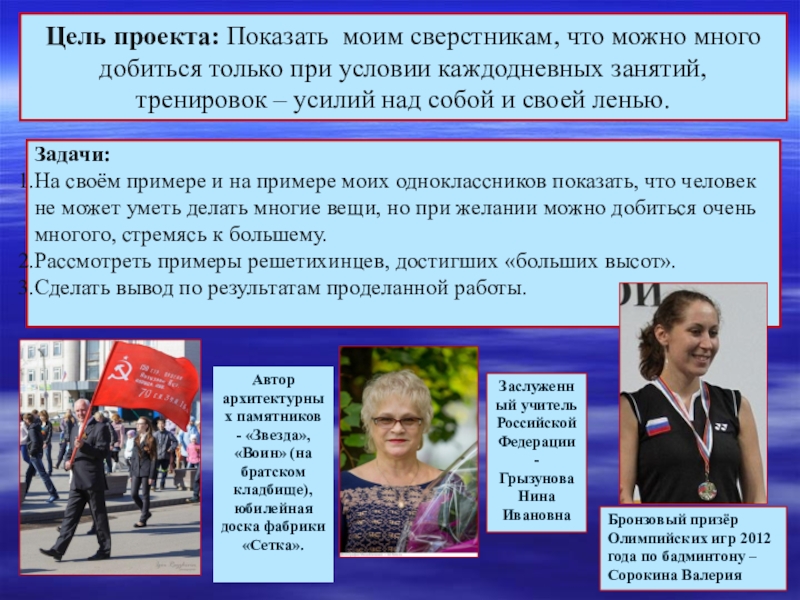 На своём примере и на примере моих одноклассников показать, что человек не может уметь делать многие вещи, но при желании можно добиться очень многого, стремясь к большему.