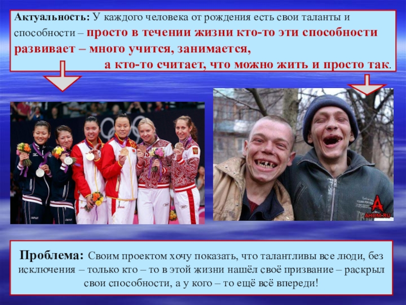 Проблема: Своим проектом хочу показать, что талантливы все люди, без исключения – только кто – то в этой жизни нашёл своё призвание – раскрыл свои способности, а у кого – то ещё всё впереди!