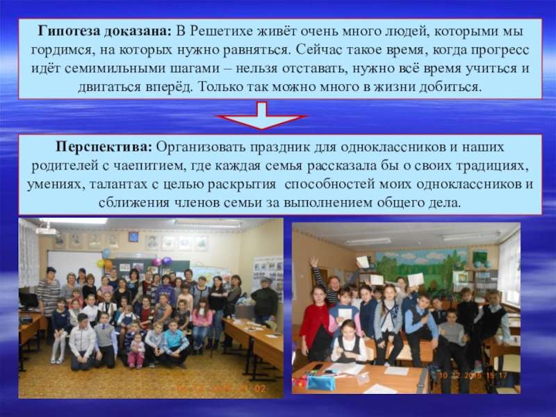 Перспектива: Организовать праздник для одноклассников и наших родителей с чаепитием, где каждая семья рассказала бы о своих традициях, умениях, талантах с целью раскрытия способностей моих одноклассников и сближения членов семьи за выполнением общего дела.